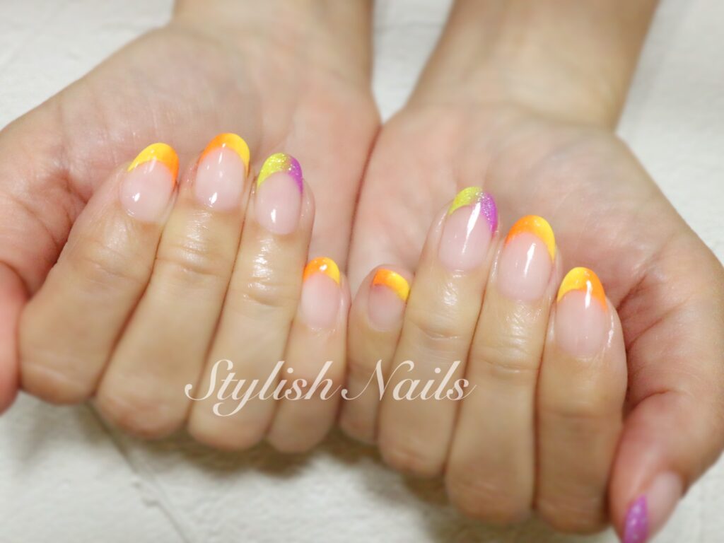 2024年7月25日 2024年7月25日 StylishNails お客様ネイルフレンチ夏季節のネイル カラフルフレンチネイル☆ ブルー&グリーンの2色フレンチ♡ ネオンカラーが夏にぴったりです(*^^*) イエロー×オレンジ×パープル♡ イエロー&パープルがポイントになってポップに仕上がりました(^_-)-☆ FacebookXBlueskyHatenaCopy