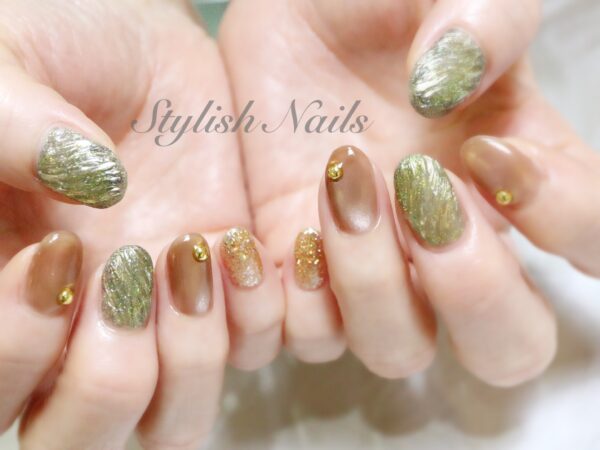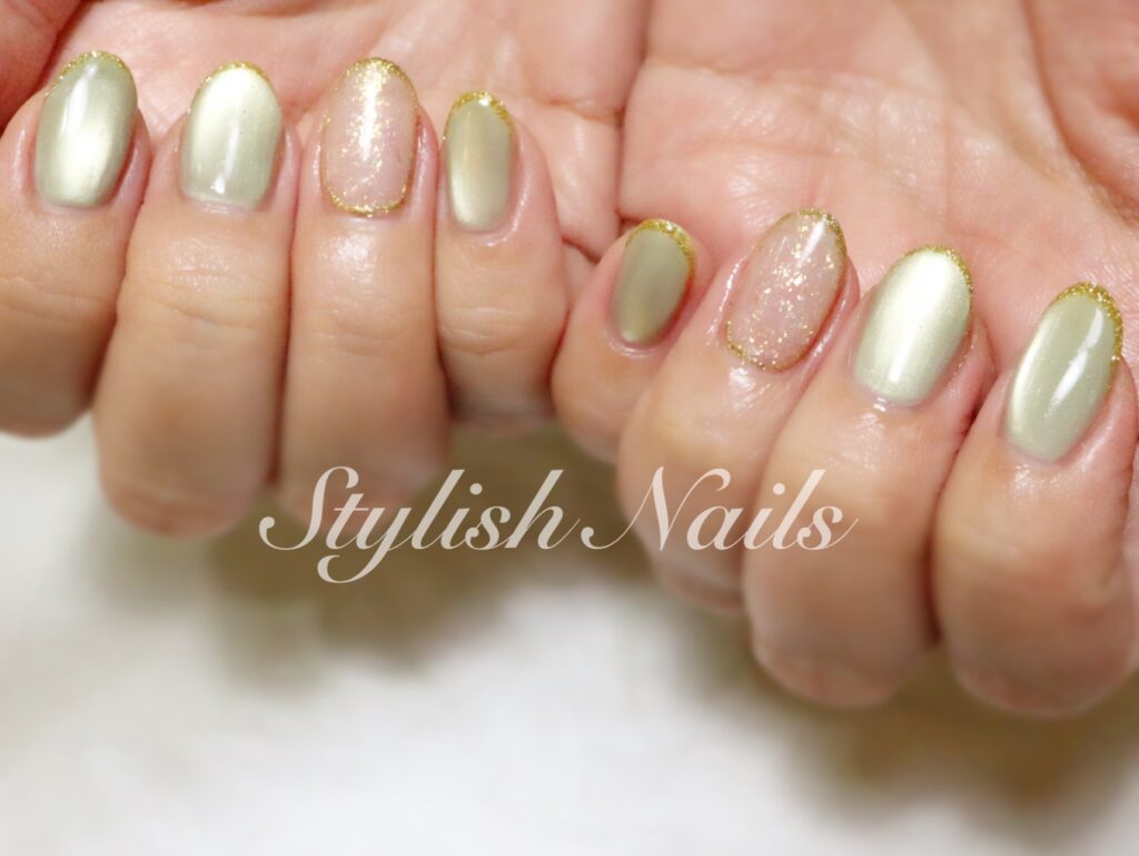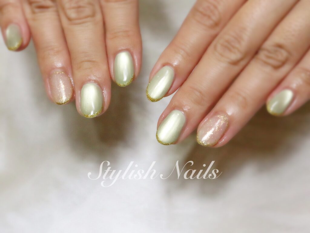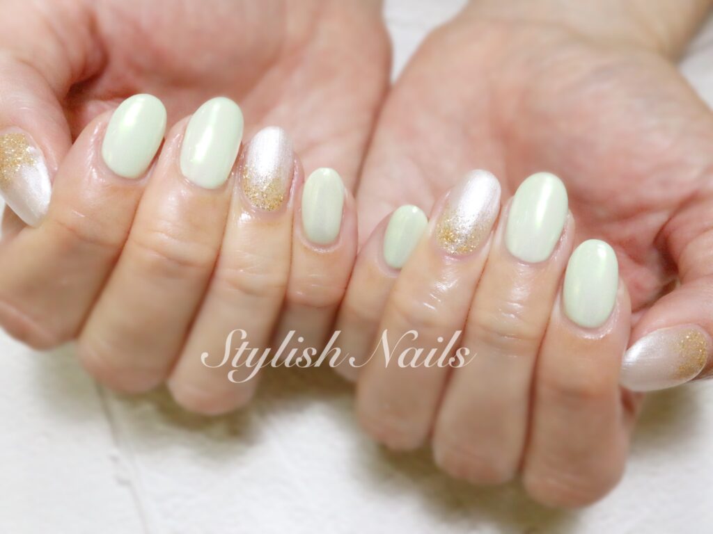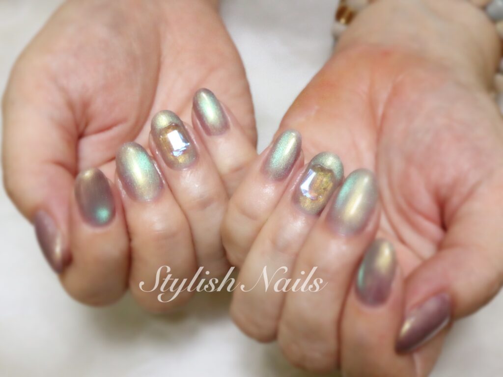 2025年11月6日 2025年11月6日 StylishNails お客様ネイルオールシーズンマグネット季節のネイル 淡いグリーンカラーマグネットネイル♡ パステルグリーンマグネット♡ パステルグリーンミラーデザイン パープルからグリーンに光るマグネット♡ FacebookXBlueskyHatenaCopy