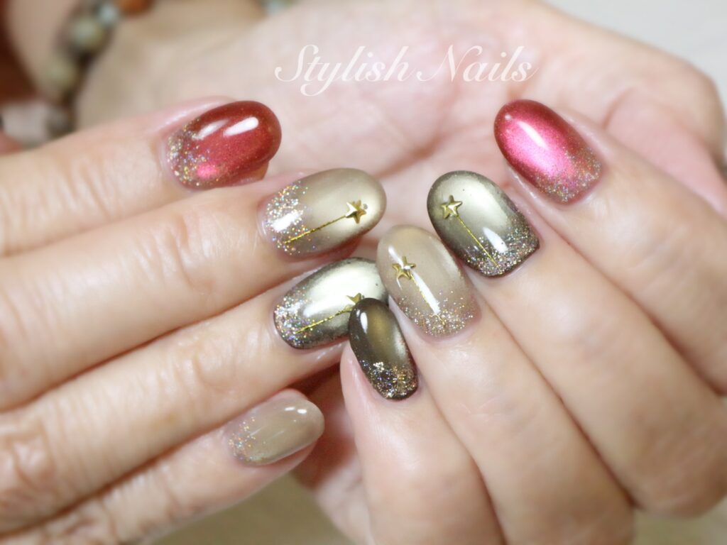 2026年1月18日 2026年1月18日 StylishNails お客様ネイルオールシーズンマグネット冬季節のネイル 冬色ネイルデザイン♡ 冬に似合うカラー レッド×カーキ×ゴールド☆ カーキ×ゴールド☆ 偏光カーキ☆ グレー×星☆ FacebookXBlueskyHatenaCopy