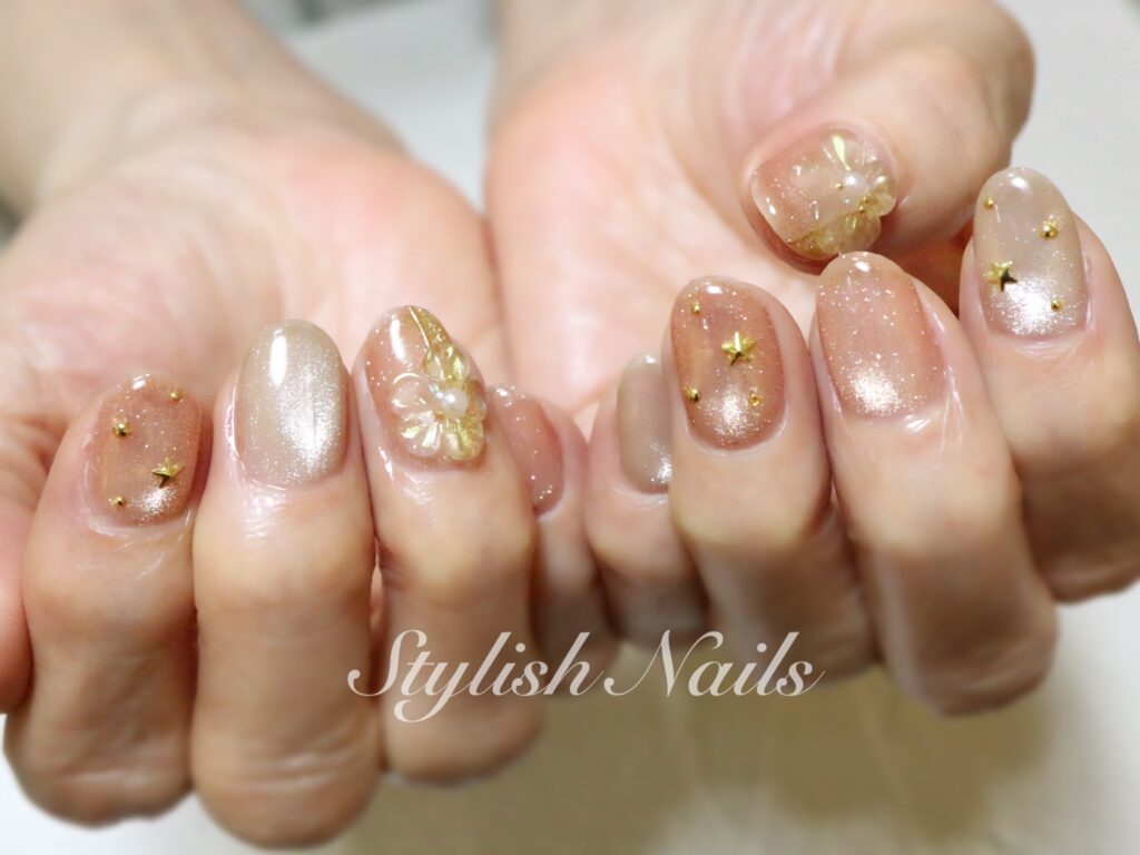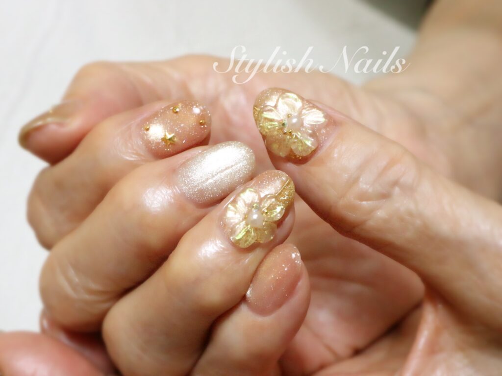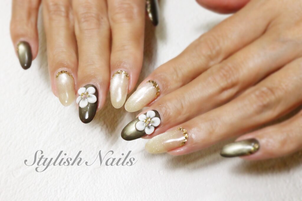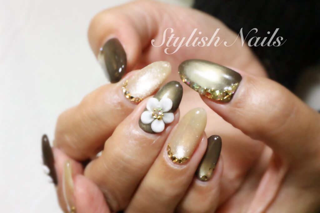 2026年2月22日 2026年2月22日 StylishNails お客様ネイルオールシーズンフラワーマグネット季節のネイル フラワーネイルデザイン♡ ゴールドに光るブラウンカラー♡ 濃いカラーにホワイトフラワーのコントラストがとても綺麗♡ シャンパンオレンジ×クリアフラワー♡ 立体のクリアフラワー♡ FacebookXBlueskyHatenaCopy